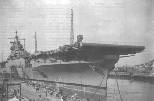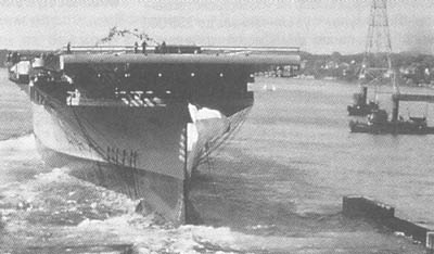 Корпус «Эссекса» на реке Джеймс после спуска на воду 31 июля 1942 г. Но это было еще не все. Удар по Пёрл-Харбору 7 декабря 1941 года вверг Америку в состояние шока и одновременно превратил войну действительно в мировую. Замешательство в правительственных и военных кругах США продолжалось недолго. Уже через неделю, 15 декабря, выдается заказ на строительство еще двух авианосцев типа «Эссекс» — CV-20 и CV-21. В августе 1942 года, когда о готовности серийно строить столь крупные корабли заявили новые подрядчики — верфи в Нью-Йорке, Филадельфии и Норфолке, следует новый заказ сразу на десять систершипов (CV-31 — CV-40). В июне 1943 года к ним добавляются еще три единицы (CV-45—CV-47). Наконец, в начале 1945 года предполагаются к постройке шесть последних авианосцев серии (CV-50—CV-55), но президент Рузвельт отменяет заказ: потребность в этих кораблях к тому времени уже отпала. Строительство авианосцев типа «Эссекс» — явление в мировой истории поистине уникальное. Осилить столь внушительную программу в те годы могла только мощнейшая промышленность США. Головной CV-9 был заложен на верфи «Ньюпорт-Ньюс» 28 апреля 1941 года. Планировалось ввести его в строй в марте 1944-го, однако он был сдан 31 декабря 1942 года — на 15 месяцев раньше! Кажется невероятным, но постройка гигантского, напичканного новым и зачастую непроверенным оборудованием корабля заняла всего 20 месяцев. Второй авианосец — CV-10 «Бон Омм Ричард» (еще на стапеле переименованный в «Йорктаун» — в честь погибшего у Мидуэя предшественника) — верфь построила за 16,5 месяца, то есть вдвое быстрее, чем по графику. Абсолютный же рекорд скорости строительства принадлежит «Франклину» (CV-13): он вошел в строй через 14 месяцев после закладки. Ненамного отстал от него и построенный на верфи «Бетлехем» CV-19 «Хэнкок» — 14,5 месяца.