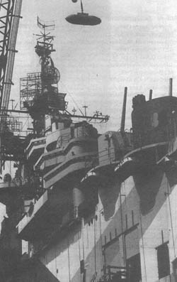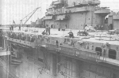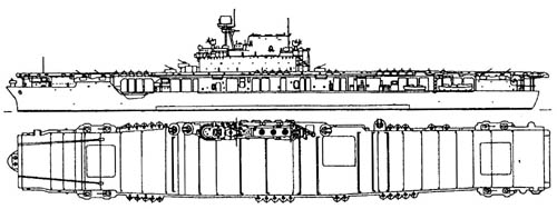 Погрузка боезапаса на авианосец «Хэнкок» перед его отправкой на театр военных действий, апрель 1944 г. Любопытно, что вместе с, безусловно, прогрессивными решениями в техническом задании на проектирование авианосца уживались требования совершенно консервативные, с сегодняшней точки зрения — просто курьезные. Так, тогдашние адмиралы были убеждены, что самолеты должны иметь возможность совершать посадку на палубу с обеих сторон — как с кормы, так и с носа. А для этого нужно было не только установить в носовой части второй комплект аэрофинишеров, но и обеспечить... 20-узловую скорость заднего хода корабля, чтобы при отсутствии ветра уменьшить посадочную скорость самолета. Или еще один пример: из четырех катапульт две предполагалось установить на полетной палубе, а две — поперек корпуса в ангаре; последние должны были запускать летательные аппараты в обе стороны перпендикулярно диаметральной плоскости корабля! Шеф Бюро морской авиации, а в прошлом — командир «Лексингтона» адмирал Тауэрс горячо поддержал столь экзотическое авиаоборудование и одновременно отверг бортовой самолетоподъемник — перспективную конструкцию, предложенную техническим бюро Генерального совета. К тому времени стало очевидным, что выполнить все позиции техзадания и при этом уложиться в стандартное водоизмещение 20 200 т нереально. Генеральный совет санкционировал увеличение водоизмещения авианосца сначала до 23 000 т (предельное значение для новых кораблей данного класса по Лондонскому морскому договору 1936 года), а затем — до 26 000 т. Впрочем, вспыхнувшая в Европе Вторая мировая война сняла все политические ограничения на размеры боевых кораблей; теперь росту авианосцев, линкоров и крейсеров могли препятствовать лишь экономические соображения.
