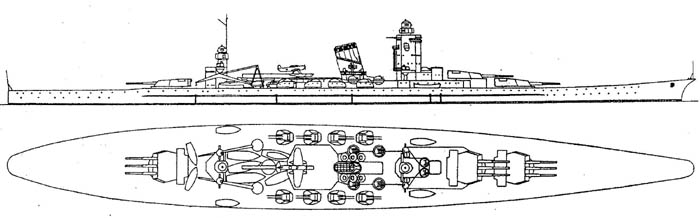![]() Линейный крейсер B-64 И в тактическом плане японский флот во многом преуспел. Поскольку вся кампания против США на море выливалась в необходимость остановить направлявшуюся к Японским островам могучую бронированую армаду американских линкоров, противостоять которым в открытом бою японцы не могли, то ставка была сделана на нанесение противнику в ночь перед решающим боем массированного торпедного удара. Для этого планировалось задействовать мощное и отлично подготовленное «Соединение ночного боя», которое по сложной японской организации в принципе соответствовало 2-му флоту (1-й флот—линейный). Внешнее кольцо охранения линкоров противника, по оценкам японского штаба, состоящее из «вашингтонских» (тяжелых) крейсеров, планировалось прорывать линейными крейсерами 3-й эскадры (типа «Конго») и тяжелыми крейсерами 4-й эскадры (типа «Атаго»). Затем в дело вступали тяжелые крейсера 5-й (типа «Миоко»), 7-й (типа «Могами») и 8-й эскадр (типа «Тоне»). Основной же удар наносила эскадра торпедных крейсеров и флотилии эсминцев 16-корабельного состава. Когда после начала второй мировой войны японцы узнали о начале проектирования в США сверхтяжелых крейсеров типа «Аляска» с 305-мм орудиями и скоростью свыше 30 узлов, они без промедления начали аналогичные работы. Их «ответом» Рузвельту стали «суперкрейсера класса А» — именно так они официально именовались в японском флоте. Их проектирование началось летом 1940 года. Два первых из них тогда же включили в «Пятую программу пополнения флота 1942—1943 гг.» под номерами 795 и 796, и уже с августа они фигурировали в списках «Соединения ночного боя» вместо устаревших кораблей типа «Конго». В сентябре предварительную схему «базового проекта В-64» закончили. Буква «В» в обозначениях японских проектов соответствовала линейным крейсерам,«А» — линкорам,«С» — крейсерам и т.д., а цифра указывала номер разработки (не путать с буквенными обозначениями классов кораблей, где «В» соответствовала линкорам, «А» — авианосцам, «С» — крейсерам и далее, как в англоязычных странах). Корабль представлял собой переходное звено между линкорами типа «Ямато» и тяжелыми крейсерами («класса А»). Даже по внешнему виду он был практически идентичен «Ямато». Поскольку уже было известно, что американские суперкрейсера проектируются с девятью 305-мм орудиями, японцы, верные своему принципу во всем превосходить противника, остановились на 310-мм калибре. Планировалась установка новых универсальных 100-мм орудий в восьми спаренных башнях, четырех спаренных (позже строенных) 25-мм автоматов и двух спаренных 13-мм пулеметов. Для участия в общих торпедных атаках «Соединения ночного боя» корабли должны были получить по два палубных четырехтрубных 610-мм ТА. Вооружение. Орудия главного калибра (310-мм) имели вес снаряда 561 кг, дальность стрельбы 32920 м при максимальном угле возвышения 45° и скорострельность 3 выстрела Е минуту. Общий запас снарядов (540) был явно недостаточным. 100-мм орудие типа 98 было прекрасным средством ПВО с досягаемостью по высоте 13 000 м (угол возвышения 90°). При весе снаряда 13 кг по баллистическим характеристикам (начальная скорость 1000 м/с, дальность по горизонтали 19 500 м) и скорострельности (15—20 выстр./мин) оно превосходило универсальное 127-мм орудие, которое тогда обеспечивало дальнюю ПВО практически всех кораблей японского флота. С