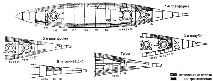 ![]() Торпедное повреждение Линкор 21 сентября вышел в Перл-Харбор для окончательного ремонта, включая докование, очистку корпуса и установку дополнительного зенитного вооружения. Работы продолжались с 30 сентября по 17 ноября, когда он вышел к Нумеа, о. Каледония. Возвращение в строй поврежденных кораблей и прибытие новых заставило вице-адмирала Холси, командующего флотом США в южной части Тихого океана, реорганизовать свои силы. Во главе с авианосцами «Саратога» и «Энтерпрайз» образовали оперативные группы контр-адмиралов Рамсея и Шермана, а «Норт Кэролайн», «Вашингтон» и новый «Индиана» стали ядром соединения артиллерийского прикрытия TF64, которым стал командовать контр-адмирал Ли. Базируясь на Нумеа, корабли несколько раз выходили в Коралловое море, прикрывая подвоз подкреплений на Гуадалканал, но боевых столкновений с противником не имели. 18 марта 1943 года «Норт Кэролайн» лег курсом на Перл-Харбор, чтобы пройти модернизацию артиллерии и систем управления огнем, которая заняла около месяца. После боевых учений в районе Гавайских островов он принимал участие в эскортировании английского авианосца «Викториес» («Victorious») к Нумеа, куда прибыл 27 мая. Присоединившись к оперативной группе авианосца «Саратога», «Норт Кэролайн» продолжал патрулирование с целью прикрытия района Соломоновых островов. Начиная с 1 июня линкор участвовал в операциях по поддержке высадок на центральные Соломоновы острова и северное побережье Новой Гвинеи, входя в состав авианосного оперативного соединения в качестве единицы прикрытия. Это соединение прикрывало вторжение на острова Новая Джорджия (30 июня), Велла Лавелла (15 августа) и Бугенвиль (1 ноября). Только 17 сентября линкор вернулся в Перл-Харбор, чтобы подготовиться к операции по захвату островов Гильберта. 10 ноября «Норт Кэролайн» вышел из Перл-Харбора в составе Авианосной Оперативной Группы 50.2, образованной вокруг «Энтерпрайза» (Северная Группа Прикрытия), чтобы принять участие в захвате островов Макин, Тарава и Абемама (архипелаг Гильберта). Первый удар самолеты нанесли 19 ноября по острову Макин. Три дня целью были объекты в гавани, орудийные позиции и скопления японских войск. Ночью 25-го «Норт Кэролайн» и другие корабли отбили нападение японских самолетов. Следующим вечером самолеты «Энтерпрайза» провели показательный бой. Два новых истребителя «Хеллкэт» в сопровождении оборудованного радаром торпедоносца «Эвенджер» были наведены на строй японских самолетов радаром своего авианосца. Затем торпедоносец, используя собственный радар, вывел истребители в пределы видимости противника. После того как в полной темноте два бомбардировщика были сбиты остальные, никак не ожидавшие нападения с воздуха, открыли огонь друг по другу, а затем в панике повернули назад. 28 ноября «Норт Кэролайн» присоединился к группе авианосца «Саратога» и продолжил действия в районе островов Гильберта. 8 декабря он участвовал в обстреле острова Науру, выпустив 538 фугасных снарядов по ведущей к японской авиабазе железнодорожной ветке, радиостанции, укреплениям на берегу и радарным установкам. Уйдя на Новые Гебриды для пополнения припасов, линкор 24 декабря покинул Эфейт в составе группы авианосца «Банкер Хил», которая должна была нанести отвлекающий удар по японской авиабазе на Кавьенге (Новая Ирландия) и их су